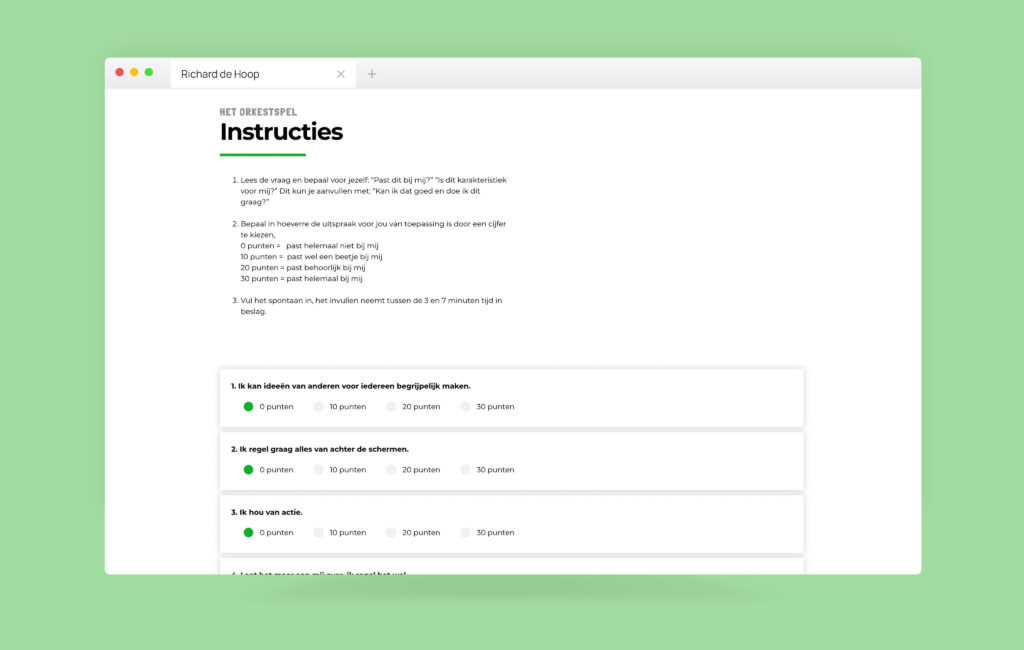 Richard zou Richard niet zijn als hij geen interactief, speels element op zijn website wilde. Samen bedachten en ontwikkelden we het “Orkestspel”: een unieke online quiz. Bezoekers beantwoorden een aantal vragen en ontdekken spelenderwijs welk muziekinstrument het beste bij hun persoonlijkheid of rol in een team past. Dit is niet alleen een leuke, laagdrempelige manier om bezoekers te engageren, maar het is ook een slimme tool voor leadgeneratie.